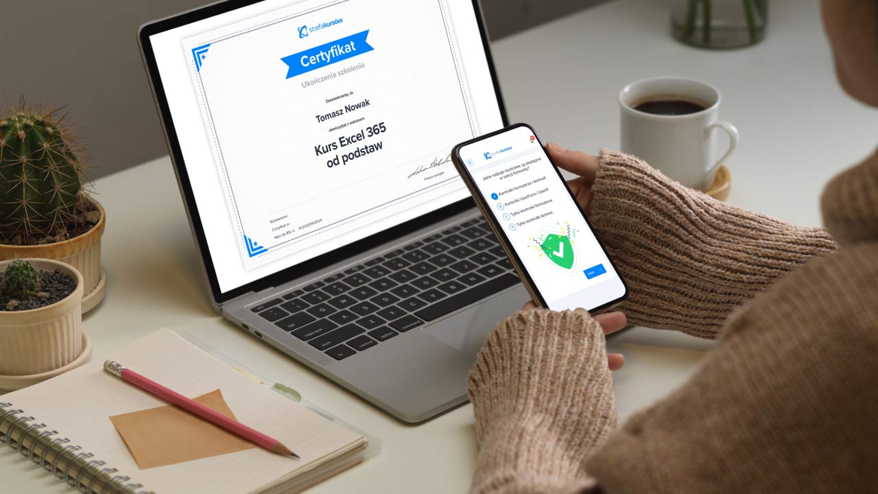 Certyfikat ukończenia kursu z twoim imieniem i nazwiskiem otrzymasz w formie PDF. Możesz go więc wydrukować, dołączyć do swojego CV, lub udostępnić w sieci, np. na LinkedIn lub w innych social mediach.